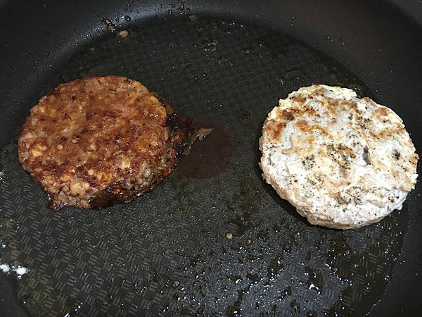 肉排下鍋煎熟(左邊是烏賊排,右邊是鮪魚排)