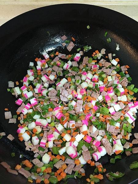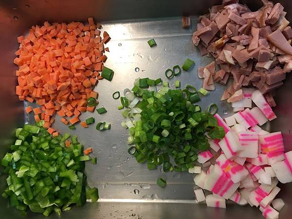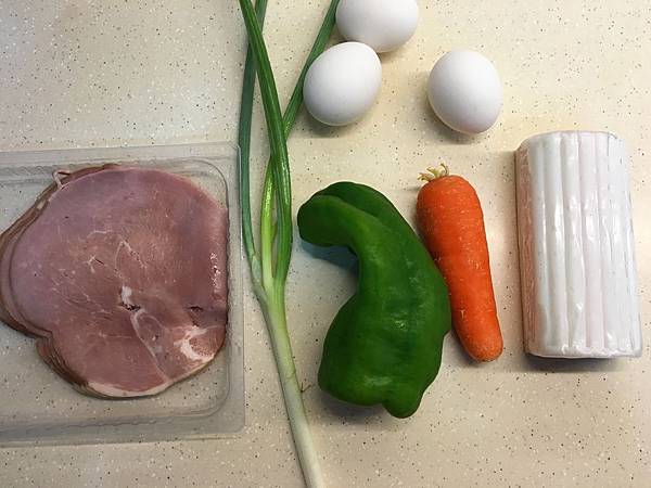 食材:雞蛋 、 青蔥 、青椒 、紅蘿蔔 、魚板 、叉燒或火腿