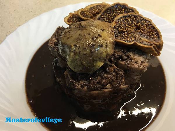放上鴨肝、無花果片淋上醬汁就完成了