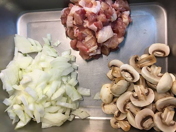 洋蔥切碎,洋菇切片,雞腿切丁