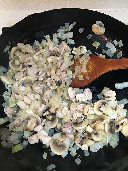 雞腿丁,洋蔥,洋菇,用橄欖油炒熟