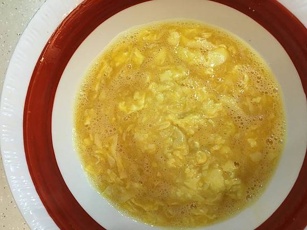 半熟蛋液倒回碗內重新攪拌一次,這是為了讓蛋液的熟度均勻也比較好塑型,是新手的小撇步