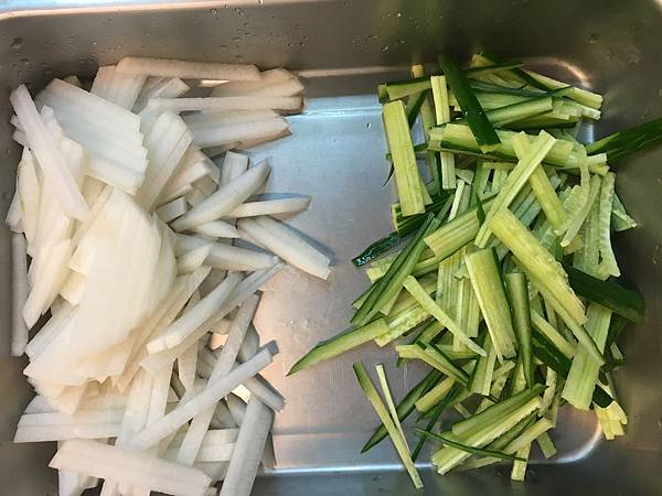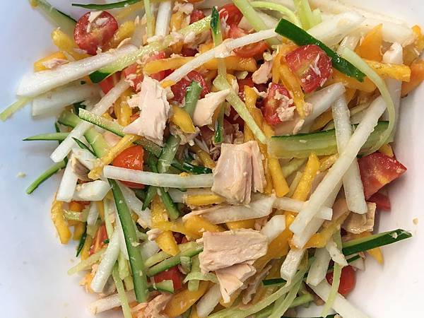 硬柿切絲加入鮪魚罐頭,所有食材混和均勻