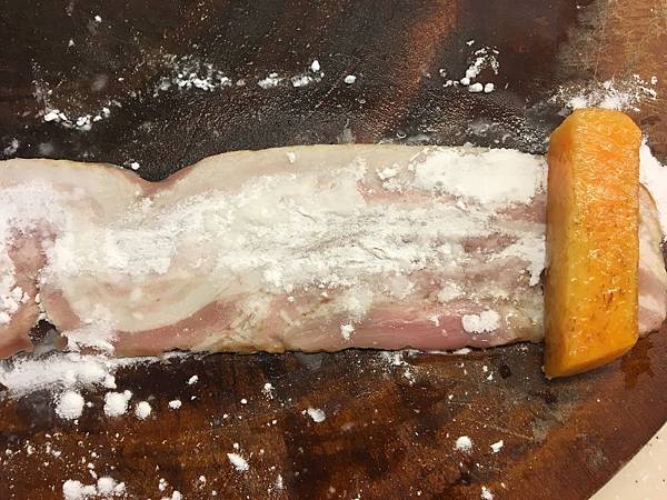 培根一面抹上太白粉,硬柿切成條狀用培根捲起來,以牙籤固定