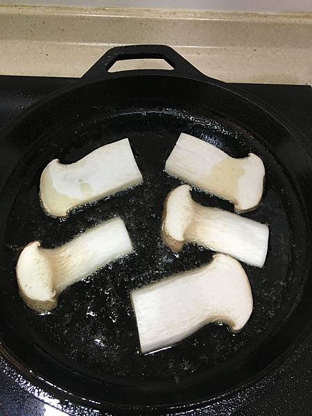 取出培根卷後鍋中加入酒,切片的杏鮑菇下鍋煎熟,最後以鹽、黑胡椒調味