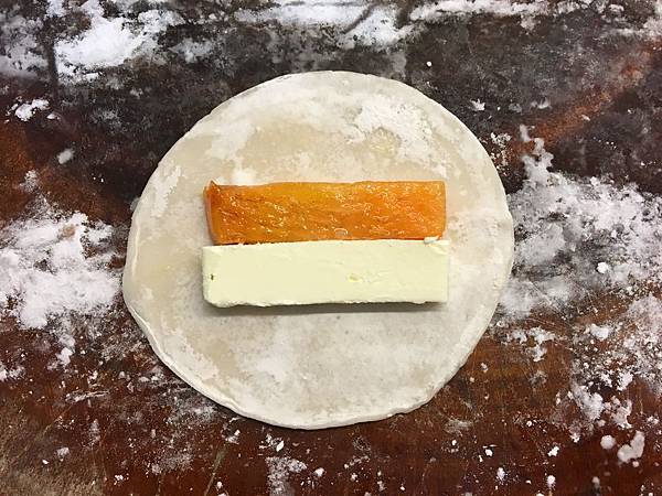 硬柿、奶油起司切成條狀,餃子皮邊緣沾水包起來