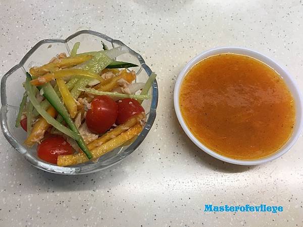 生菜沙拉吃起來清脆爽口,帶著柿子醬汁的甜味