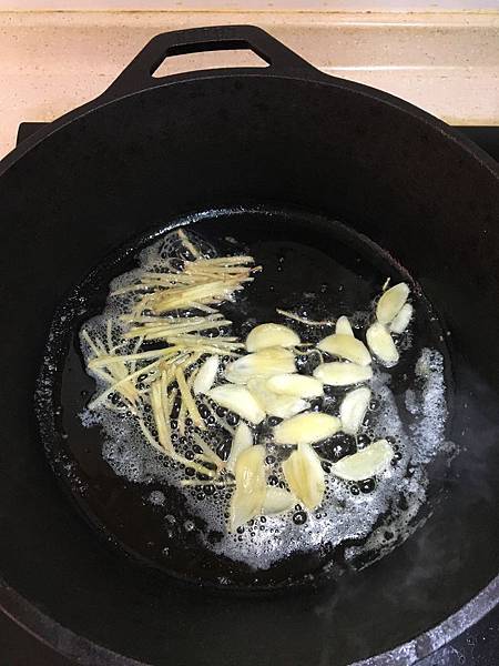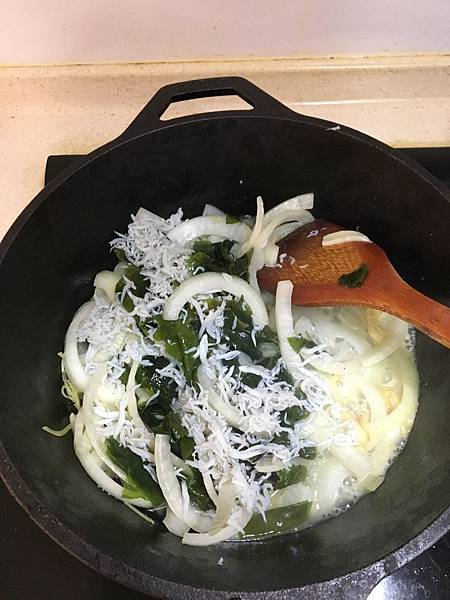 薑切絲,大蒜切片用橄欖油爆香,放入切片洋蔥、吻仔魚、酒、胡椒拌炒