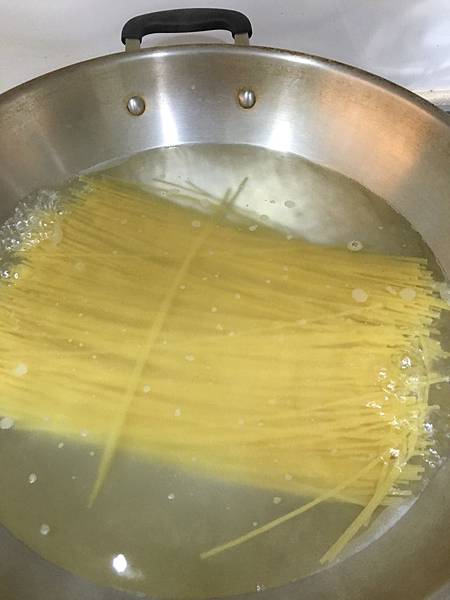 放入義大利麵拌炒,最後延鍋緣倒入一小匙醬油