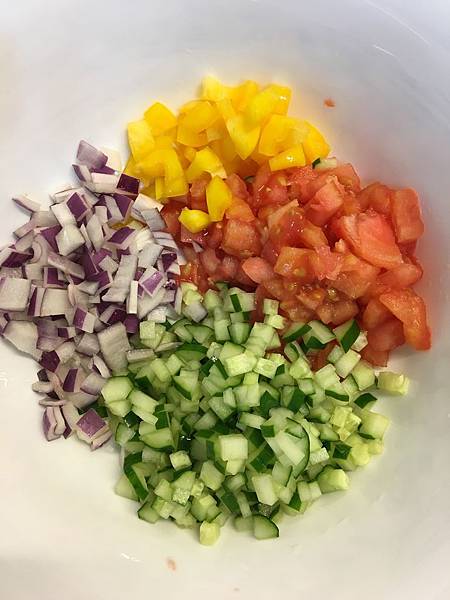 洋蔥、小黃瓜、黃甜椒、番茄切丁