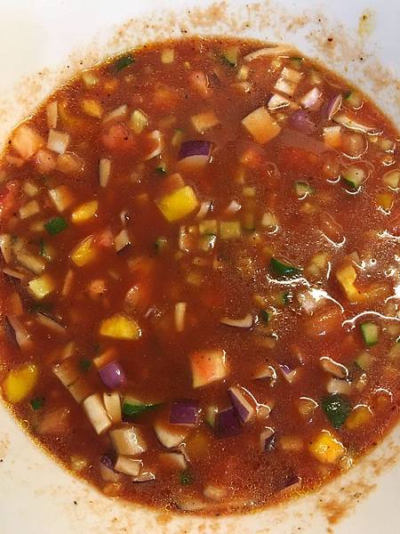 冷湯帶點辛辣味,嘗得到各種蔬菜顆粒的甘甜,可能很多人不喜歡它的酸味,不過夏天喝冷湯挺不錯的