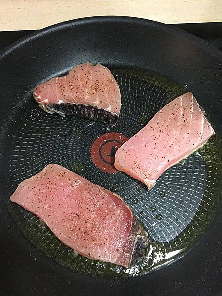 旗魚排撒上黑胡椒、鹽下鍋煎熟