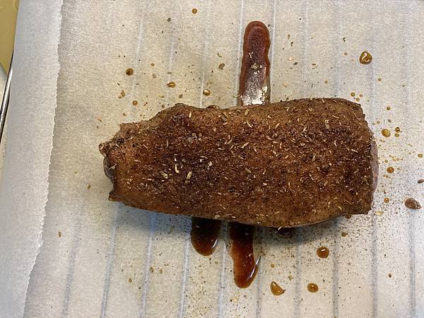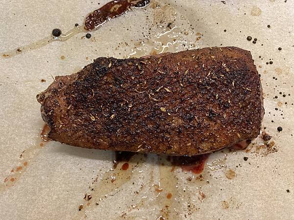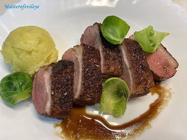 烤好的鴨胸肉切片(因為醬汁有醬油和蜂蜜所以看起來有點黑,並非燒焦)