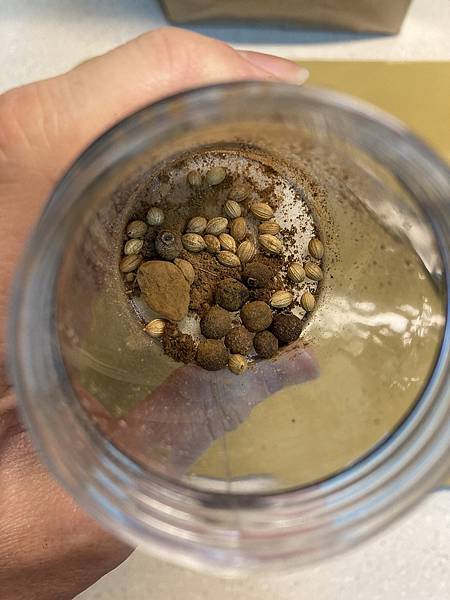 胡荽,胡椒粒,小茴香,孜然,丁香,多香果用研磨器磨碎
