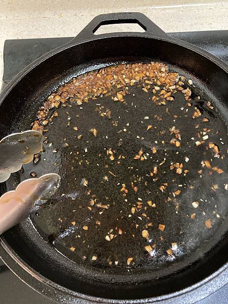 剩餘的醬汁倒入鑄鐵鍋中濃縮