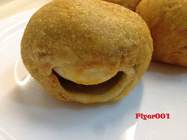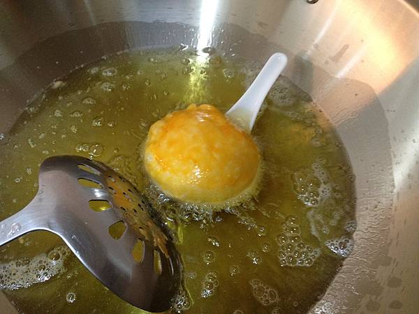 下油鍋油炸,炸好後小心將湯匙取出,勿用力拔出,不然就會變成口裂女包子
