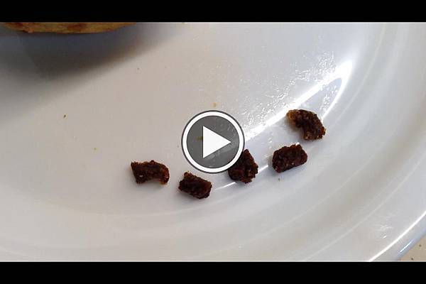 我切了牛肉丁拿去油炸直到變硬,不過嘴巴太小+比米粒稍大的牛肉丁,錄影時聲音異常的小,連背景的雜音都比笑聲大