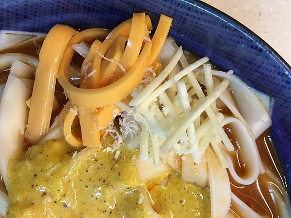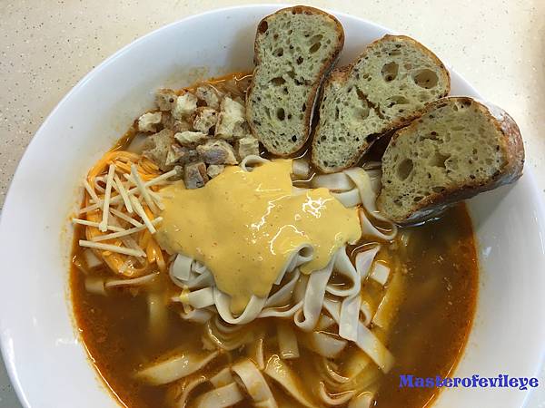 將麵,乳酪絲,麵包丁,麵包脆餅放入湯碗裡,法式魚湯拉麵完成