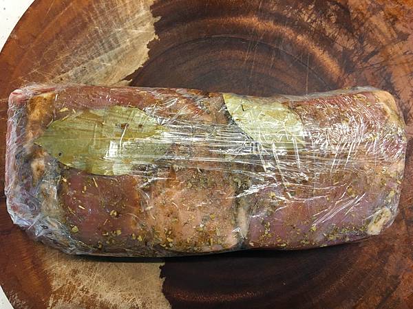 選一塊完整的五花肉,可自行切割肉片讓它有漂亮的形狀。將肉平放在保鮮膜上,把調味料均勻塗抹在肉塊上。用保鮮膜把月桂葉和肉塊裹起來,要確定肉塊的每一寸都有抹到鹽巴跟調味料。
