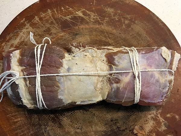 第6天把保鮮膜打開,把肉沖洗乾淨,用紙巾拍乾,這時的培根就可以開始切片烹煮了(先放入冷凍庫讓它稍微冰硬一點會比較好切)