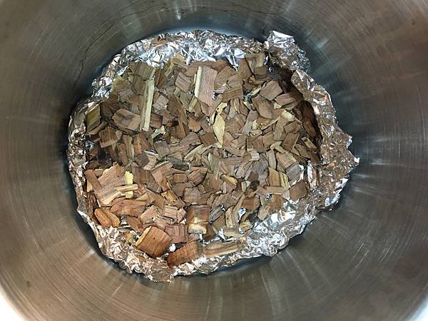 可用卡式瓦斯爐在自家陽台煙燻,鍋底先放鋁箔紙,再放牧豆樹片