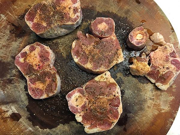 將牛尾肉撒上黑胡椒、丁香、鹽、麵粉