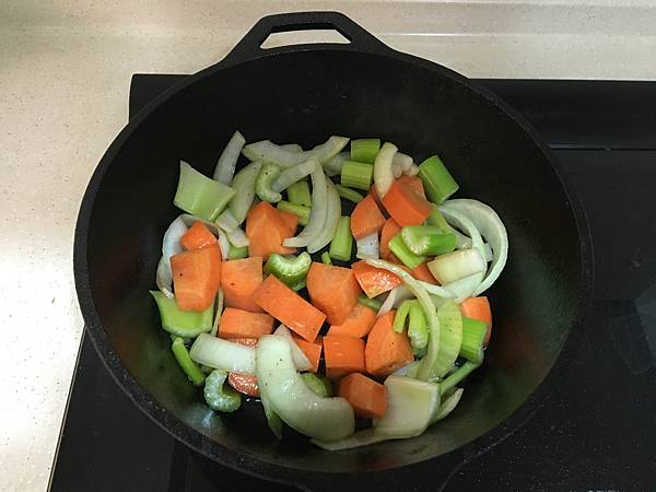 將洋蔥切片、紅蘿蔔 、 芹菜切成適當大小放入鍋中炒到表面變色