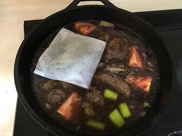 把紅酒與牛尾、高湯加入,要讓湯蓋過所有的肉,再加入蕃茄
