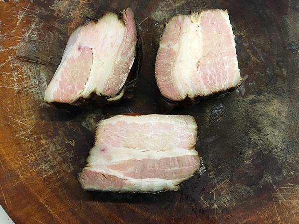 煙燻過後就可以直接切來吃了,不過沒先煎過的話,味道會比較強烈尖銳
