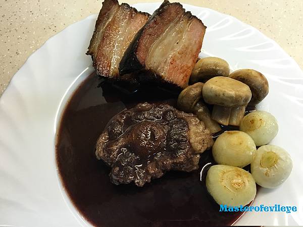 將牛尾肉,配菜擺盤,淋上過濾的醬汁