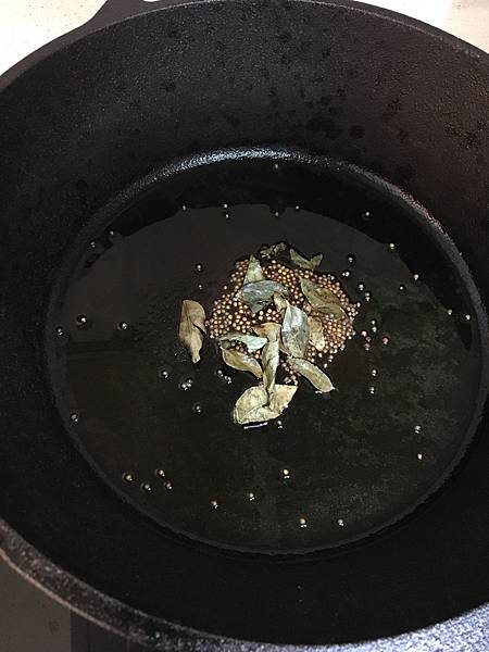 肉桂、芥末子、咖哩葉放入鍋中加熱