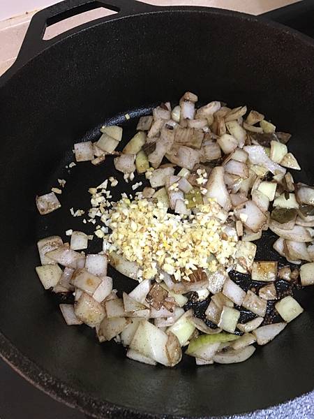 加入洋蔥炒成褐色,再加生薑、大蒜炒出香氣