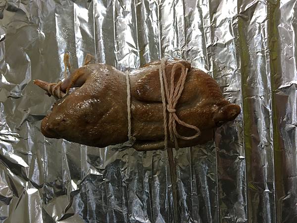 用繩子綁起來放進烤箱烤 ,雙腿記得也要用繩子綁起來,不然兩腿開開的鵪鶉,因為大小的關係會很像田雞
