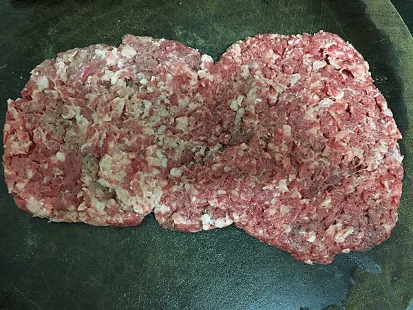 牛絞肉拍平,撒上黑胡椒,鹽