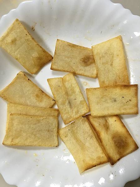 馬鈴薯切片,用大量的油下鍋煎炸至酥脆
