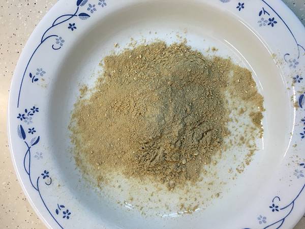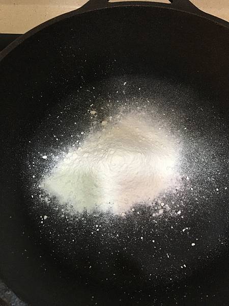 將麵粉放進乾鍋中,用小火慢烘,期間不斷翻炒混合,加熱至麵粉全部呈現淡茶色