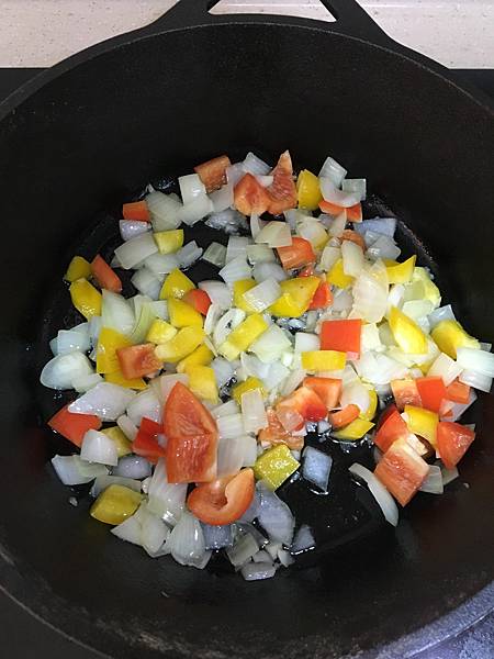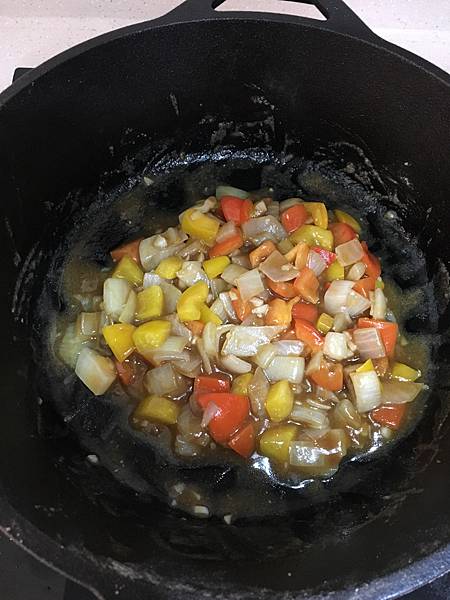 鍋子燒熱後放入2匙橄欖油,先放入切1公分丁狀的洋蔥、大蒜和甜椒,炒至金黃焦香,繼而放入麵粉。