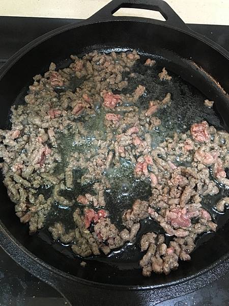 鍋子大火燒熱後放入1匙橄欖油,把牛絞肉吵到鬆散,加1匙鹽巴、黑胡椒,再倒入紅酒煮一會兒。