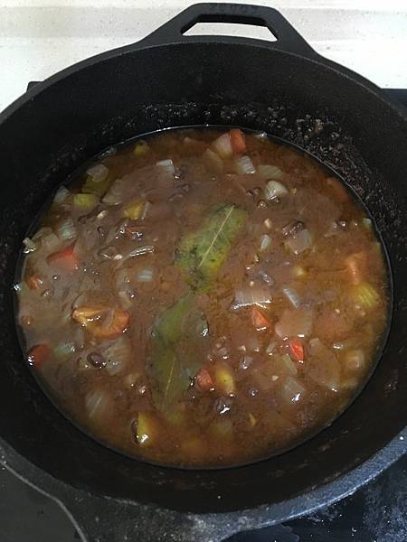 將2者放入一起加入月桂葉燉煮,讓醬汁表面呈現冒泡狀持續燉煮。