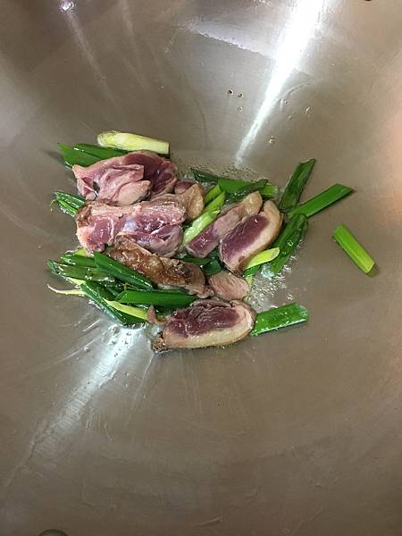 用鴨油爆香蔥段,鴨肉切片下鍋煎熟,加入醬汁翻炒備用