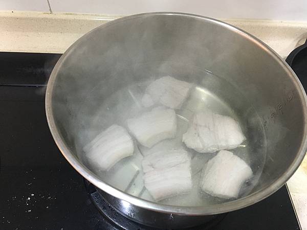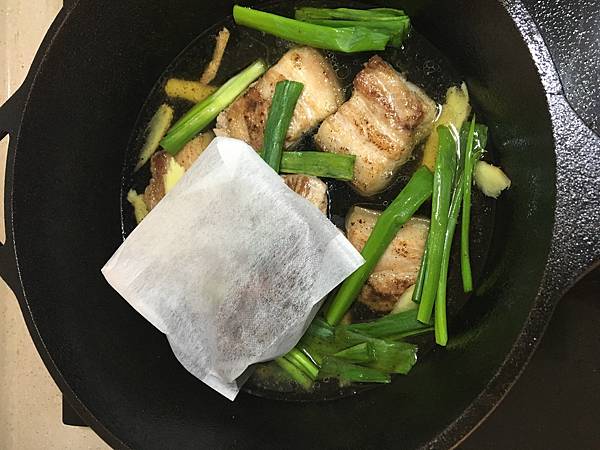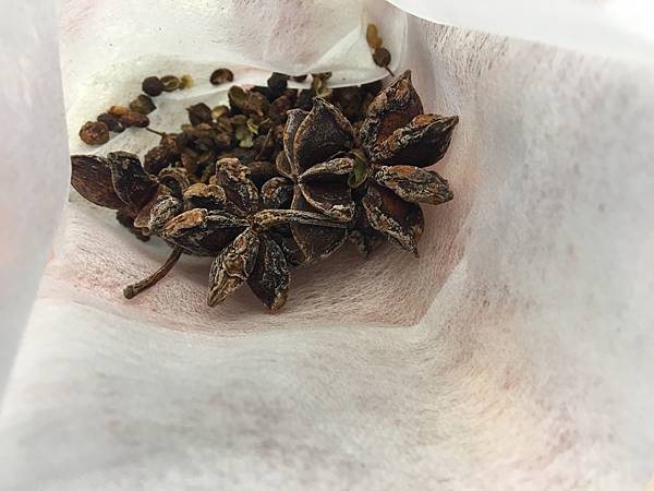 水、薑、蔥綠、八角與花椒放入鍋中燉煮