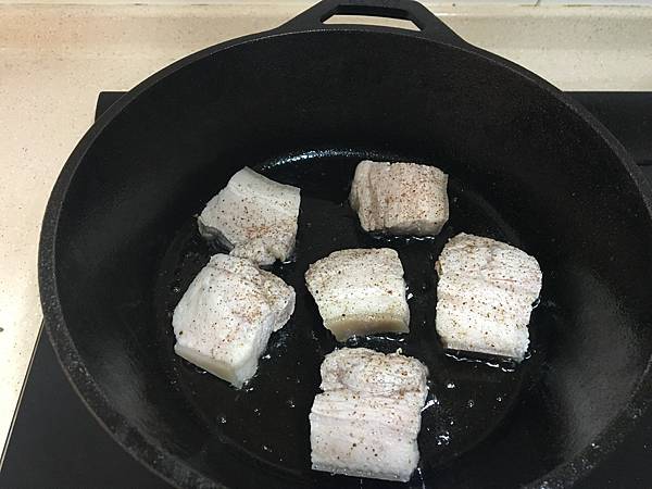 將燙好的五花肉撒上花椒粉煎至金黃色