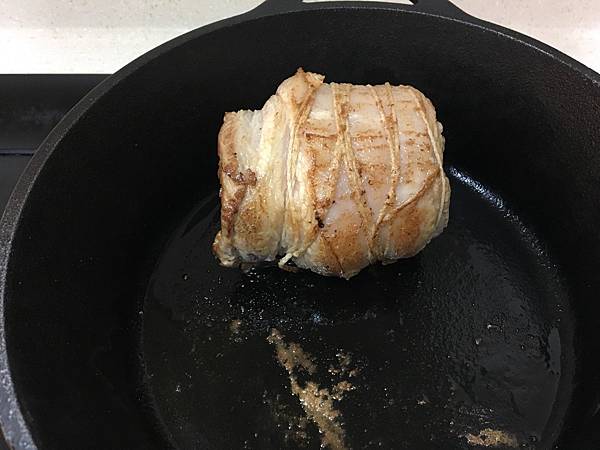 五花肉去皮,由於是有時間限制的比賽,所以將五花肉內側塗上醬料[大蒜、醬油、酒、砂糖]