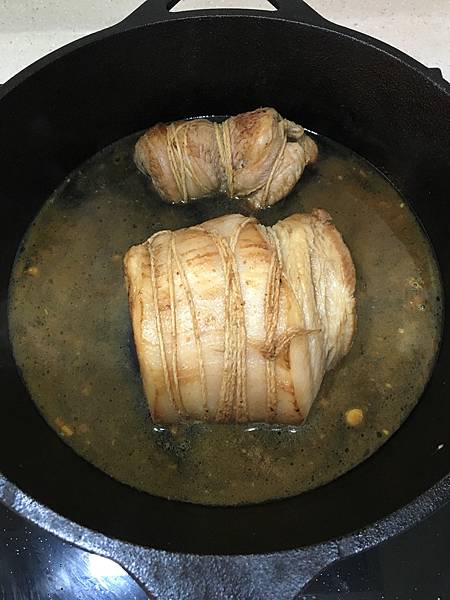 倒入醬料+水淹過豬肉燉煮,燉煮完畢先取出放涼再切片。