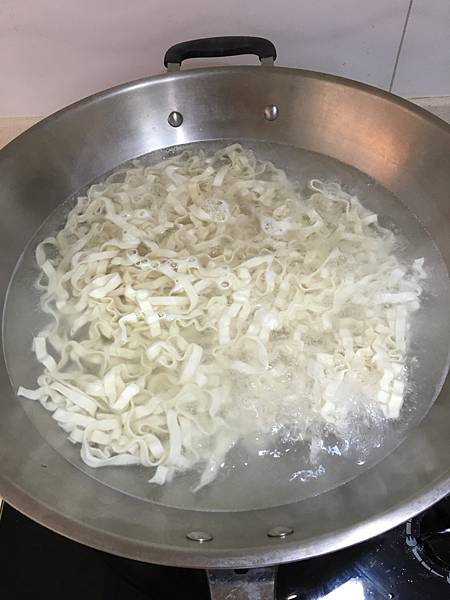 略寬的捲拉麵下水煮,煮好後撈起瀝乾水分