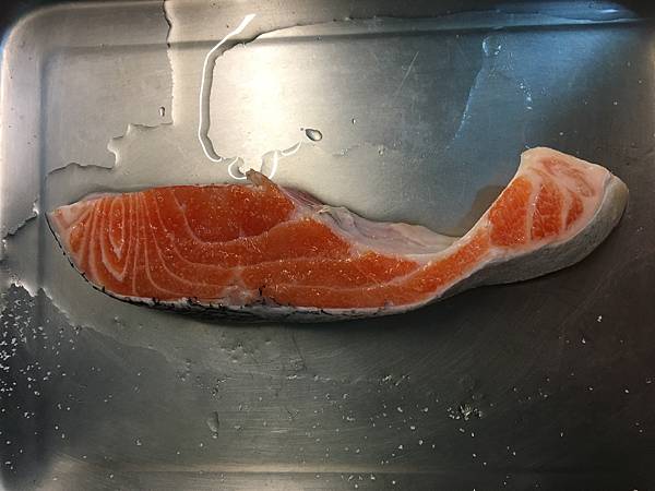 鮭魚灑點酒,2面撒鹽,出水後以紙巾吸乾