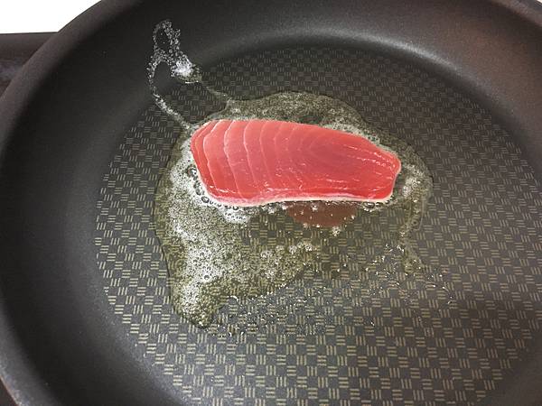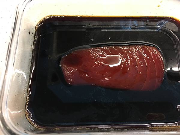 a.味醂、紅酒煮至微滾使酒精揮發,加入醬油關火放涼,放入鮪魚醃漬