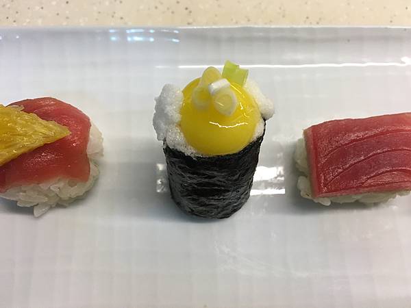 海苔捲起醋飯,放上鮪魚碎肉、蛋白霜、鵪鶉蛋黃、蔥花