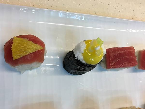 奶油可以增加鮪魚的香氣,如果有用到含有鮪魚脂肪的部位,放上山葵和橙片的壽司可以解膩