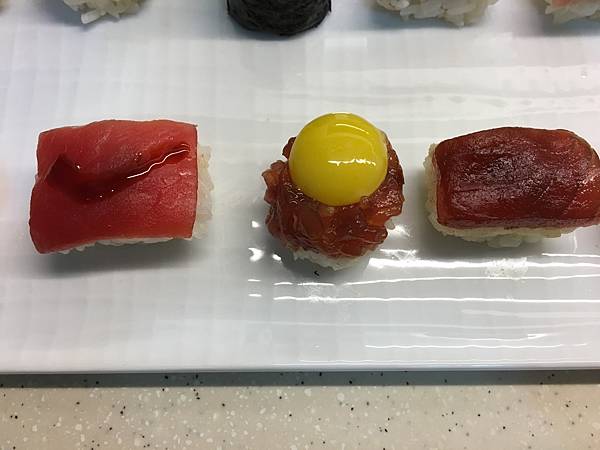 醃漬鮪魚醬油味道會更深厚,鵪鶉蛋黃可以使壽司味道更濃郁
